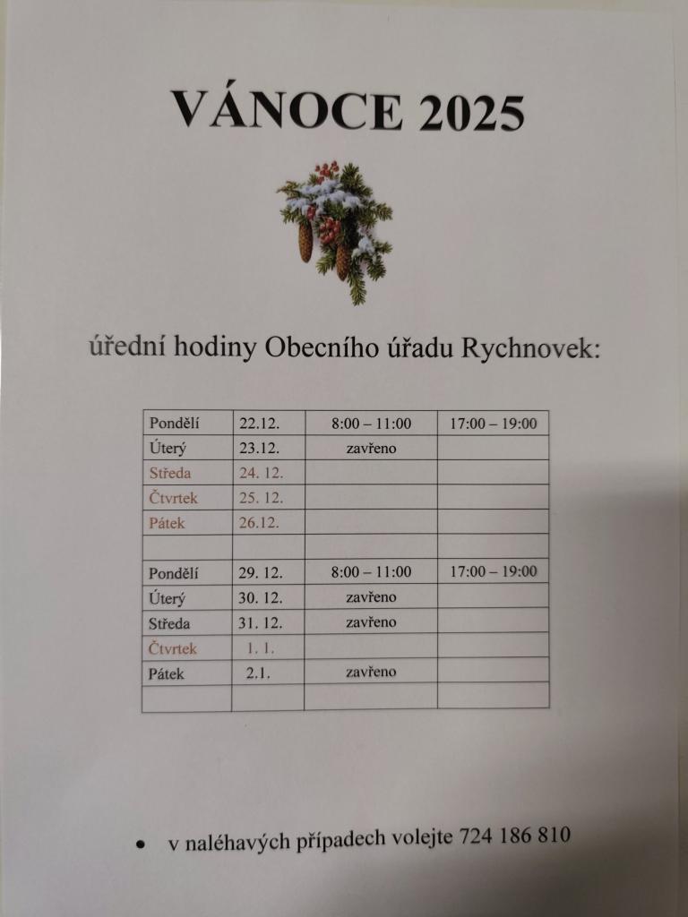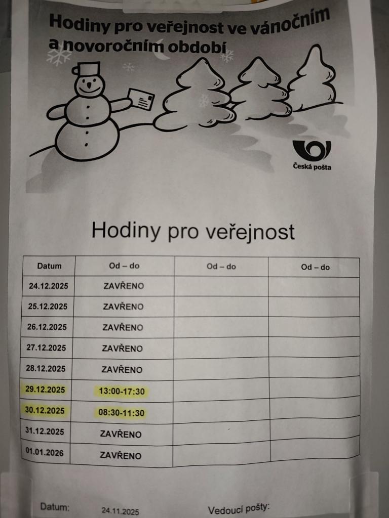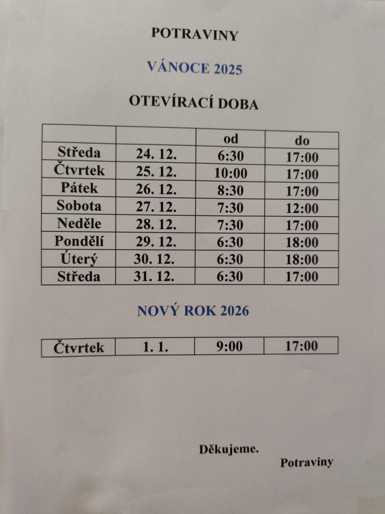 Níže informujeme o otevírací době/úředních hodin potravin, pošty a OÚ v období Vánočních svátků.